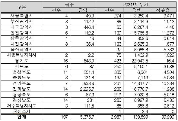 지역별로는 전라남도 2,296억 원, 전라북도 834억 원, 경기도 649억 원, 그 밖의 지역이 1,596억 원이다.