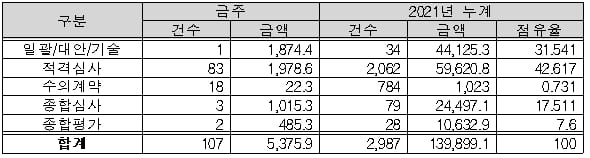 계약구분별로는 기본설계기술제안 1,874억 원, 종합평가 485억 원, 종합심사 1,015억 원, 적격심사 1,979억 원, 수의계약 22억 원으로 집행될 예정이다.