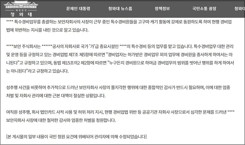 지난 18일 청와대 청원 게시판엔 인천국제공항보안 사장에 대한 엄중 감사와 처벌을 촉구하는 글이 올라왔다. 게시글엔 그가 여성 직원 2명을 성추행했다는 내용이 적혀 있다. 이 일은 최근 언론에 보도됐다. 언론 보도엔 그가 앞으로 조심하겠다는 내용을 적을 글을 게시판에 부착한 내용도 보도됐다.