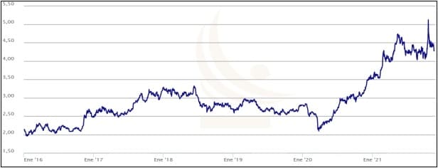 최근 5년간 칠레 구리 가격 추이