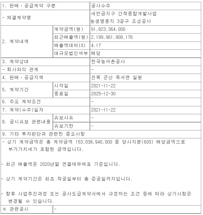 계룡건설, 새만금지구 간척종합개발사업 농생명용지 3공구 조성공사