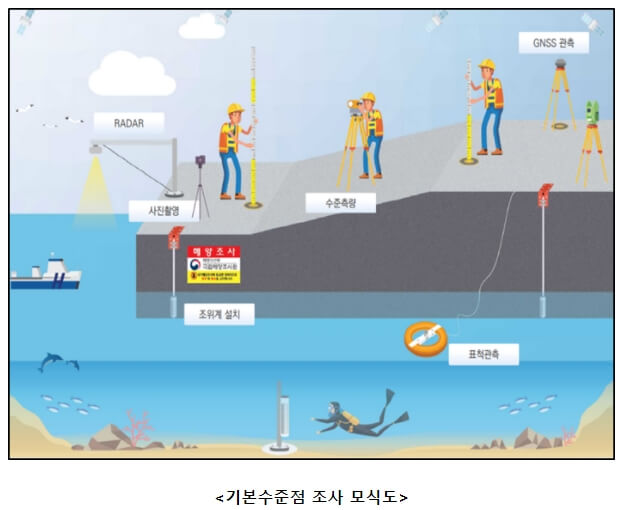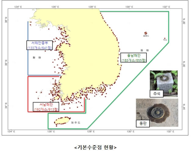 이에 국립해양조사원은 3년 주기로 서해중부, 서·남해안, 동·남해안 및 제주부근 순으로 지역별 기본수준점 순환조사를 실시하고 있다.