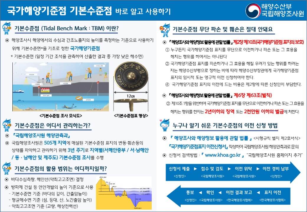 한편, 기본수준점은「해양조사와 해양 정보 활용에 관한 법률」에 따라 무단으로 이전하거나 파손하는 것이 금지*되어 있으며, 만약 공사로 인해 파손의 우려가 있을 경우 국립해양조사원에 기본수준점 표지의 임시적 혹은 영구적 이전을 신청해야 한다.