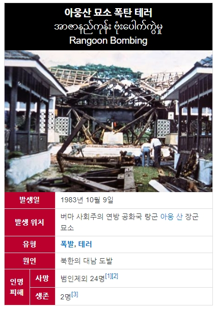 외국에서는 'Rangoon Bombing', 즉 버마의 수도 랑군에서 벌어진 폭탄 테러라 부른다.