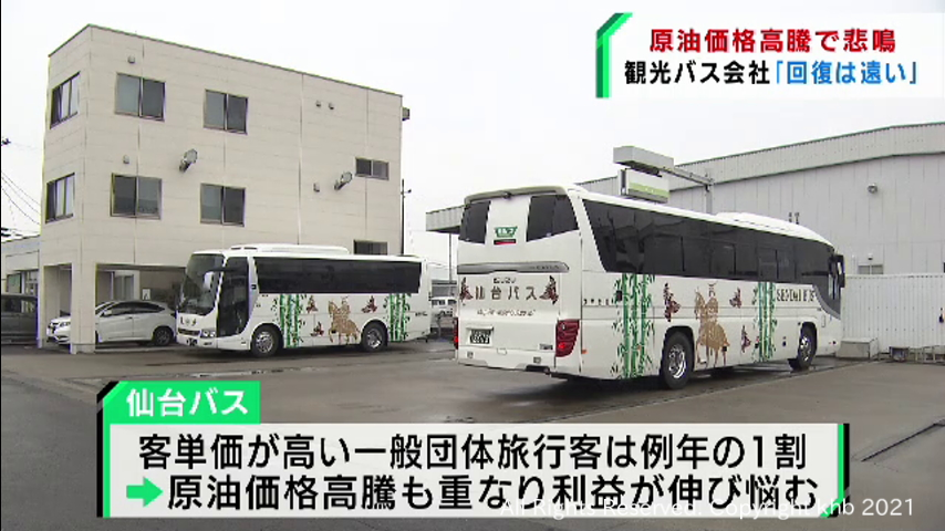 신종 코로나 감염자가 감소하는 가운데 미야기현 내 관광객은 점차 돌아오고 있지만 고유가가 장기화되기 대목을 맞은 관광버스 업체들은 비명을 지르고 있다.
