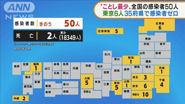 ANN의 정리에서는, 22일의 신규 감염자는 전국에서 50명이었다.