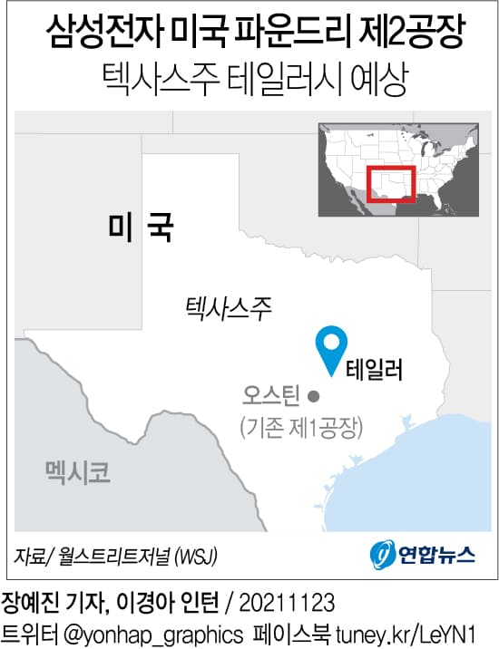 삼성전자[005930]가 미국 파운드리(반도체 위탁생산) 제2공장 부지를 텍사스주 테일러시로 결정했다고 미국 월스트리트저널(WSJ)이 22일(현지시간) 보도했다.