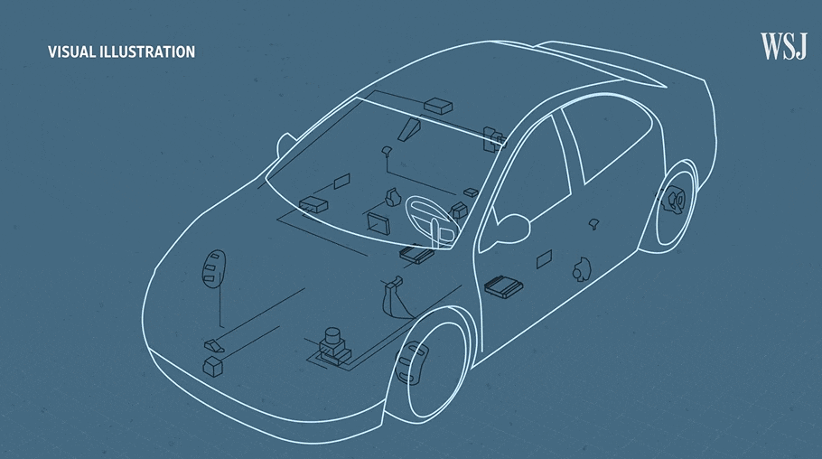 점화장치부터 제동장치까지 현대 자동차의 반도체 수는 1,000개를 넘을 수 있다. 글로벌 칩 부족이 장기화되면서 제너럴 모터스에서 테슬라에 이르는 자동차 제조업체들은 생산량을 조정하고 전체 공급망을 재고할 수밖에 없는 상황에 처했다. 일러스트/비디오: 샤론 시