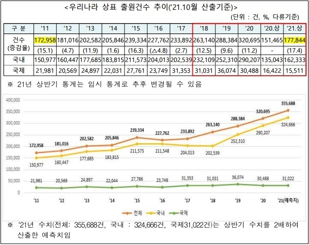 * 2021년 상반기 출원건수(177,804건)가 2011년 전체 출원건수(172,958건)를 초과
