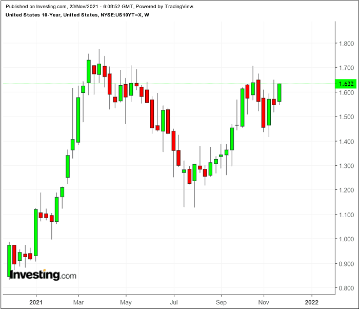미 재무부 10년물 국채인 TMUBMUSD10Y는 1.669%의 수익률이 금요일 오후 3시 기준 1.535%에서 9 베이시스 포인트 상승