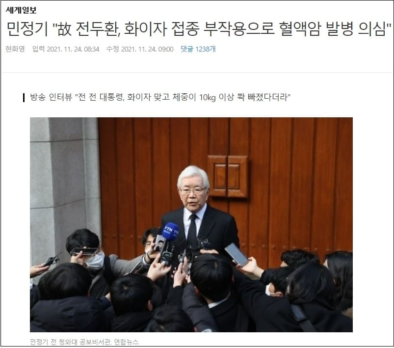고(故) 전두환 전 대통령 사망을 공식 발표한 최측근 민정기 전 청와대 공보비서관이 방송에 출연해 전 전 대통령이 화이자사(社)의 신종 코로나바이러스 감염증 예방 백신을 접종받은 후 건강이 악화했다고 주장해 눈길을 끌었다.