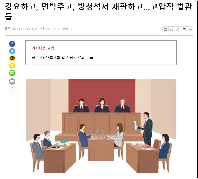 광주 지역 변호사 단체가 매년 발표하는 법관 평가 결과, 여전히 일부 판사들이 고압적인 자세로 재판을 진행해 소송 당사자들의 불만을 사고 있는 것으로 나타났다.