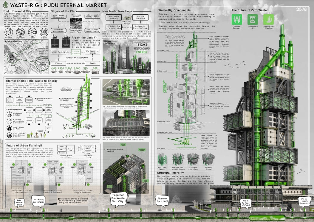 쿠알라룸푸르는 매일 3,500 미터 톤의 바이오 쓰레기를 생산한다. 한때 도시의 경제적 보석이었던 푸두시장은 시간이 지나면서 퇴보해 부정하다는 평을 들었다. 웨이스트 리그는 도시의 일상적인 쓰레기를 관리하고 보물로 만들기 위해 고안되었다. 시장과 기타 활동을 위한 공간을 갖춘 폐기물 대 에너지 플랜트로서, 이 프로젝트는 순환적이고 번창하며 보다 지속 가능한 경제에 기여한다.