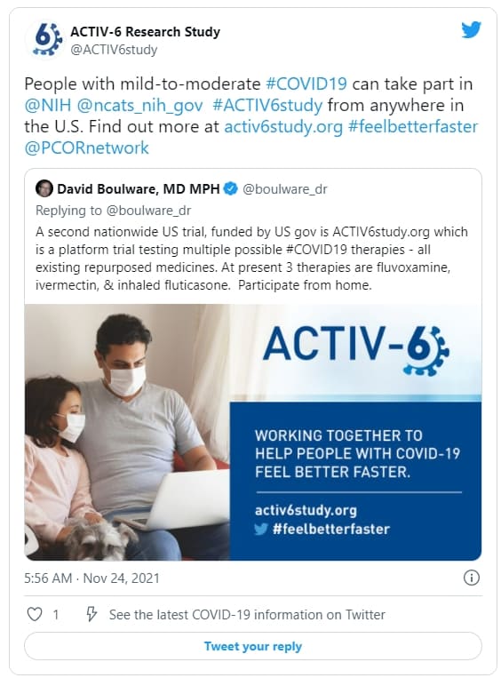 이 연구는 지난 4월 시작됐으며 지난 8월 이베르멕틴을 용도변경된 후보 약물로 추가했다. 연구자들은 ACTIVATION-6에 참여할 15,000명 정도의 가벼운 COVID-19 참가자를 계속 찾고 있으며, 모집 메시지는 소셜 미디어에 자주 게시된다. 이번 연구는 원격으로 진행되고 있으며 지난 10일 동안 COVID-19에 양성 반응을 보였으며 적어도 두 가지 증상을 경험한 미국인은 참여할 자격이 있다.