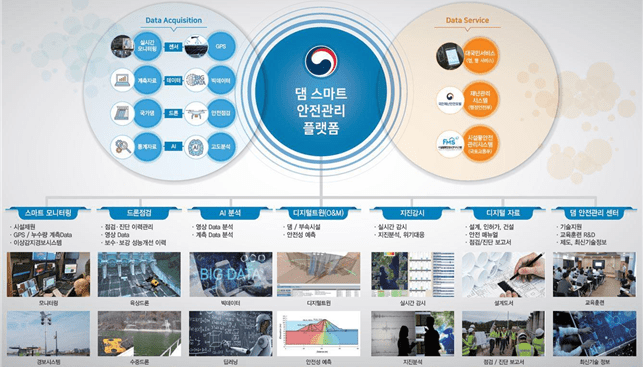 '스마트 댐 안전관리'는 ①실시간 지능형 감시(스마트 모니터링), ②무인기(드론) 기반 안전점검, ③디지털 트윈 기반 플랫폼 구축·운영으로 국가중요시설인 국가 37개 댐에서 지진, 홍수 등 자연재해로부터 선제적 대응능력을 갖출 수 있도록 단계적으로 추진된다.