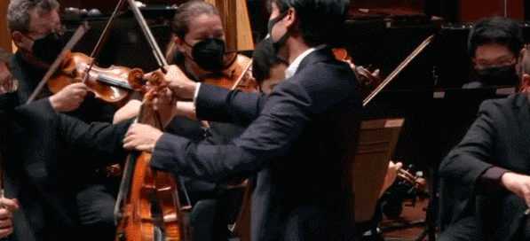 어떤 공연이든 스트레스를 받을 수 있는 상황이지만 첸은 순간적으로 연주를 이어가며 지휘자 루도비크 몰롯을 한 번 훑어본 뒤 가까이 있는 바이올린 연주자와 원활하게 악기를 주고받았다.