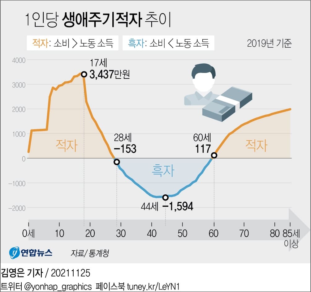 우리나라 국민은 28세부터 노동 소득이 소비보다 많은 '흑자 인생'에 진입해 41세에 노동 소득 정점을 찍고 60세부터는 소비가 노동 소득보다 많은 '적자 인생'에 들어가는 것으로 나타났다.