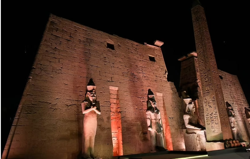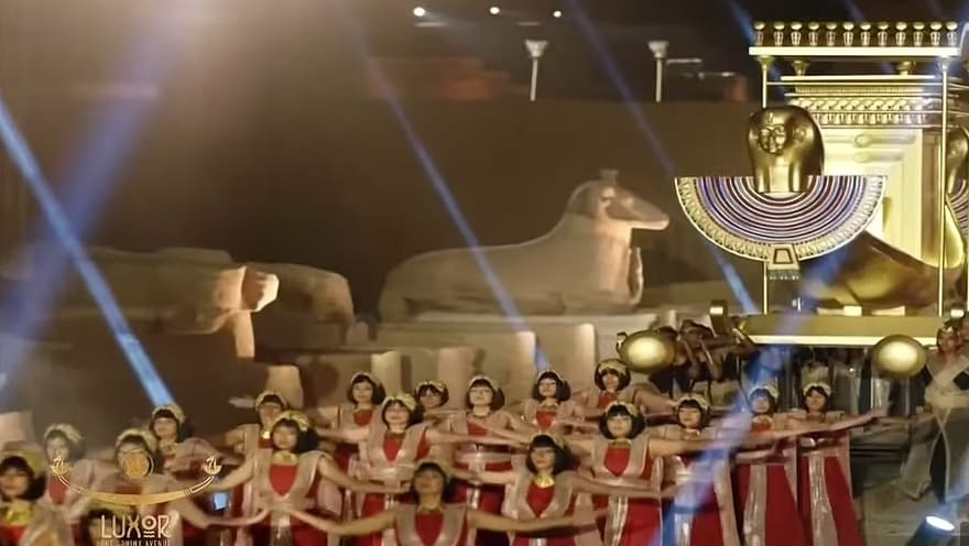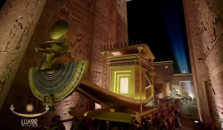 고대 이집트 전통의상을 입은 수백 명의 가수들과 무용수들이 카르나크 신전에서 걸어 나왔는데, 수천 년 전 사제들이 그랬던 것처럼 어떤 이들은 거대한 황금 배를 어깨에 메고 참여했다.