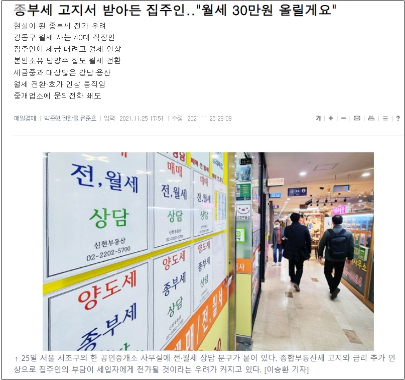 이번주부터 대폭 인상된 종부세 고지서가 날아오기 시작하자 부동산 전문가들은 세금을 많이 낸 집주인들이 전·월세 가격을 올려 세입자들에게 세금 인상분을 전가할 것이라는 지적을 쏟아냈다. 이런 말이 나온 지 며칠 지나지 않아 종부세 부과 아파트가 많은 지역에서 이 같은 우려가 현실화하고 있는 것이다. 특히 정부는 '종부세는 전 국민의 2%에 해당되는 세금'이라고 밝혀왔지만 A씨 사례에서 보듯이 종부세와 관계없던 남양주 별내면의 세입자에까지 악영향을 미치고 있는 것으로 나타났다.