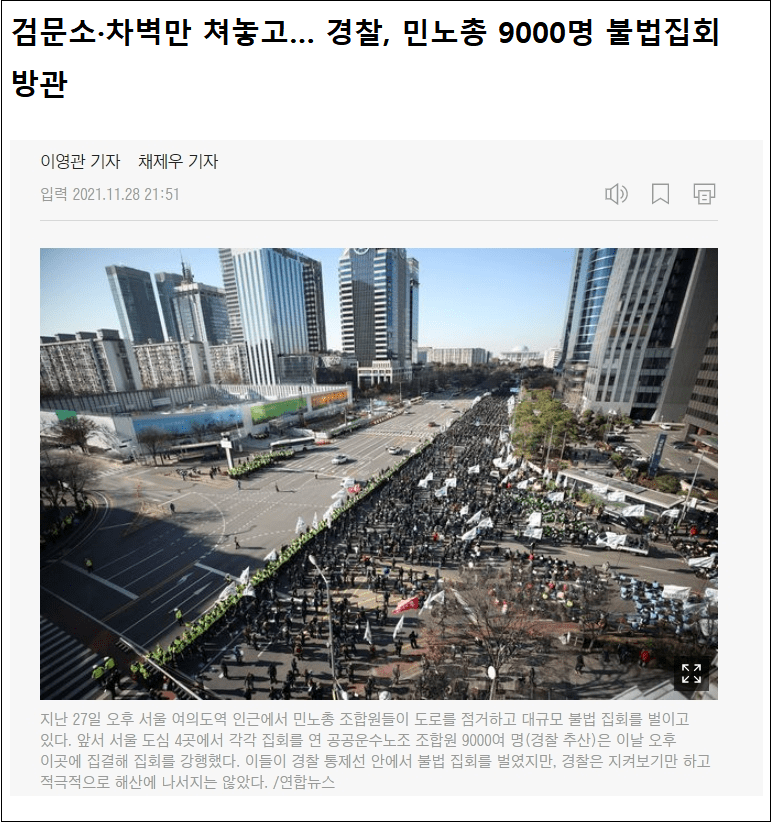 민노총이 지난 27일 서울 여의도역 인근에서 조합원 9000명(경찰 추산)이 참석한 대규모 불법 집회를 재차 강행했다. 지난 13일 서울 동대문 일대에서 2만명 규모의 불법 집회를 연지 불과 2주 만이다. 지자체와 경찰이 집회 금지를 통보해도, 민노총이 이를 무시하고 강행하는 모습이 주말 일상이 되고 있다는 지적이 나온다. 경찰은 사전에 집회 장소를 예측하고도 집회를 막지 못했고, 경고만 할 뿐 적극적인 해산에 나서지 않았다.
