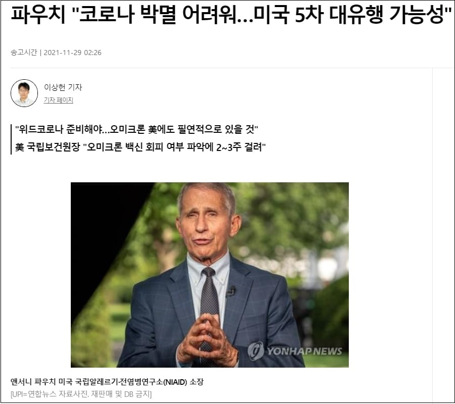 이어 파우치 소장은 ABC 방송에 출연해 오미크론이 아직 미국에서 발견되진 않았다면서도 "우린 꽤 좋은 감시 시스템을 갖고 있지만 이미 여러 국가에서 퍼졌기 때문에 필연적으로 여기에도 있을 것"이라고 말했다.