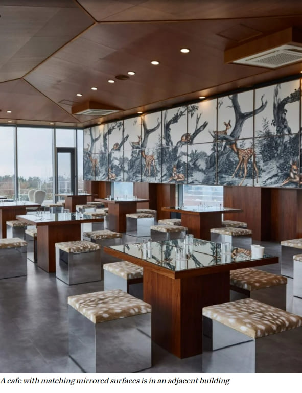 합판, 목재, 반사성 폴리카보네이트 거울 소재로 만들어진 이 디자인은 자연과 현대성을 결합하고 브랜드의 현대적 정체성을 결합하기 위한 것이다.