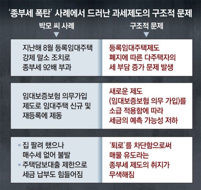 박 씨가 부모로부터 원룸주택을 증여받은 2011년은 집값이 급락했을 때였다. 투기 목적의 취득과 거리가 먼데도 거액의 종부세가 부과된 건 정부가 다주택자를 투기세력으로 간주하고 규제 일변도 정책을 폈기 때문이다. 이창무 한양대 도시공학과 교수는 “다주택자가 갖고 있는 긍정적인 기능을 간과한 정책 부작용이 종부세 급증으로 드러났다”고 지적했다.