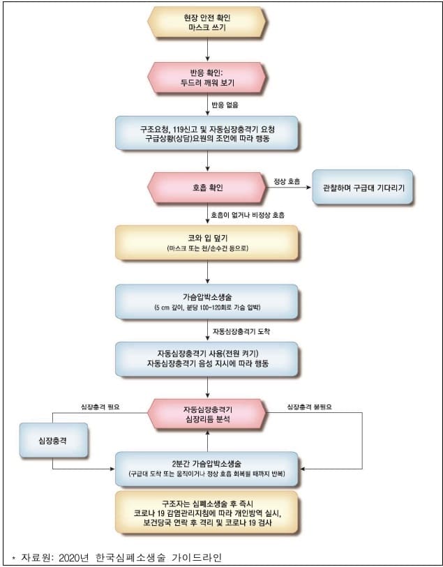 쓰러진 환자에게 즉각 심폐소생술을 실시하면, 생존율을 1.9~3.3배, 뇌기능 회복률을 2.8~6.2배로 높일 수 있다. 따라서 일반인도 심폐소생술 방법을 알아두고 환자 목격 시 바로 실시하는 게 중요하다. 다행히 일반인이 시행하는 심폐소생술을 받은 환자는 2019년 24.7%에서 2020년 26.4%로, 지속적으로 증가하고 있다는 통계가 나왔다. 질병관리청은 코로나19 등 감염 우려 상황에서 실시할 수 있는 심폐소생술 방법을 다음과 같이 소개하고 있다<그림 참조>.