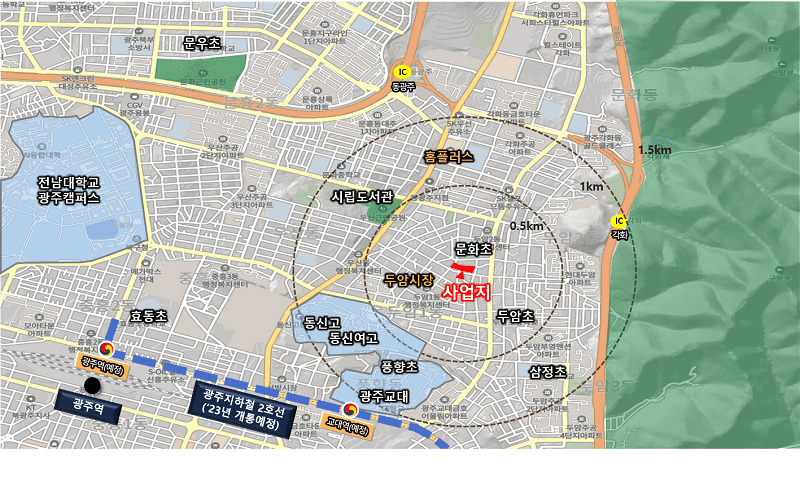 사업지는 반경 1km이내 문화초, 두암초, 풍향초, 동신고, 동신여고, 광주교대 등이 위치하며 광주 지하철 2호선 개통이 오는 2023년 예정돼 있다.