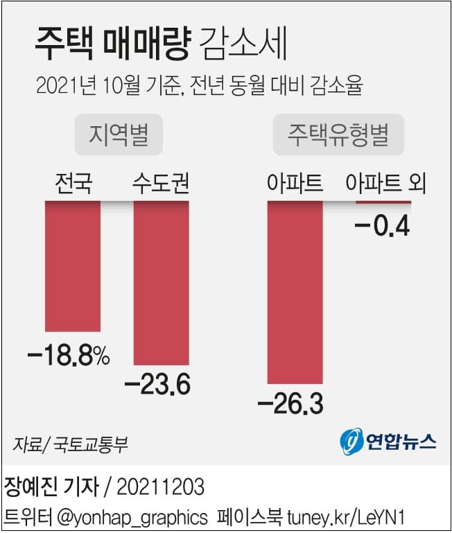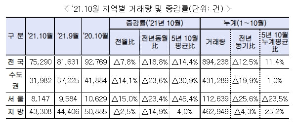 ’21.10월까지 누계 기준, 수도권(431,289건)은 전년동기 대비 19.9% 감소, 지방(462,949건)은 4.3% 감소하였다.