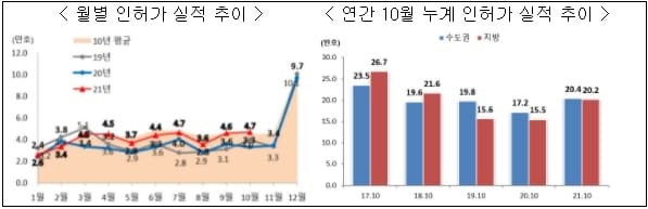 (종합)10월 누계 주택 인허가실적은 전국 405,704호로 전년 동기 대비(326,237호) 24.4% 증가하였다.