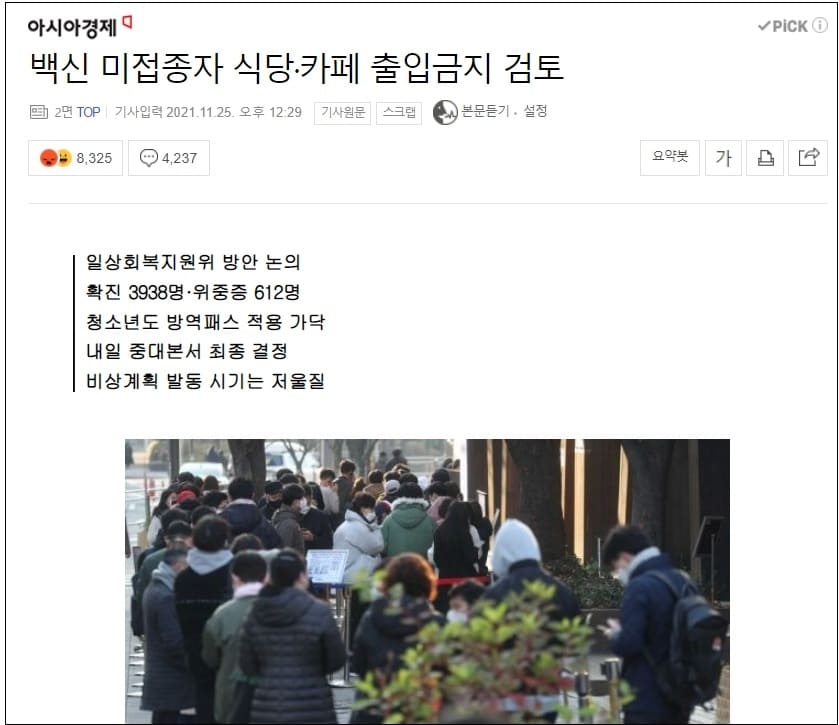 안 그래도 위드 코로나가 시행되면서 백신 패스가 도입된 것에 대하여 그리 달갑지 않은 시선이었고 개인적으로도 백신 부작용에 대한 불안 때문에 백신 1차조차 아직까지 맞지 못하고 있는 상황인데, 왜 이렇게 백신패스 확대에만 혈안이 되어 있는지 이해가 가지 않는 것 같습니다.