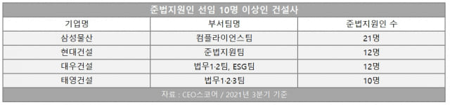 태영건설은 법무1팀(상무 1명·선임 2명), 법무2팀(선임 2명), 법무3팀(선임사원 1명·사원 4명) 등 10명의 준법지원인을 꾸렸다. 2018년 9명보다는 1명 늘었다. 이밖에 코오롱글로벌(7명), 금호건설(7명), 삼성엔지니어링(6명), 계룡건설(6명), DL건설(6명) 등은 준법지원인이 5명 이상이었다.