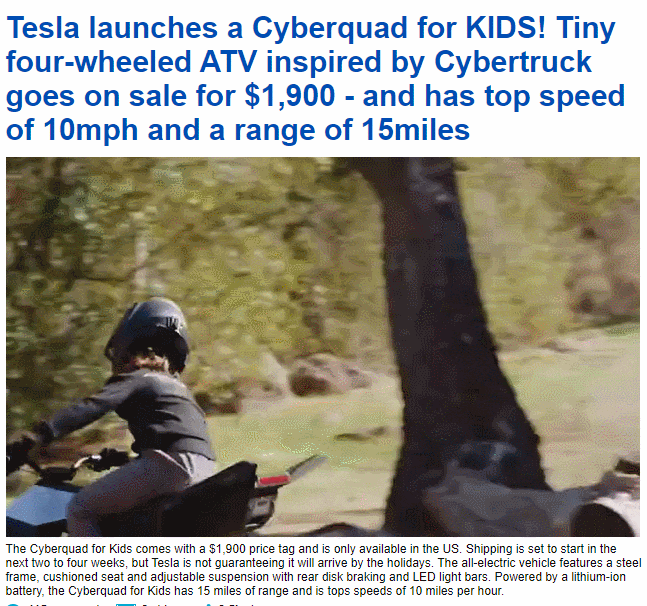 테슬라, 키즈용 사이버 쿼드 출시