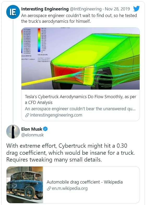 또한 한 독립적인 항공 우주 공학자에 의해 수행된 일부 컴퓨터 모델링에 따르면, 사이버 트럭의 몸이 농기구의 모든 효율성으로 공기를 가르는 것처럼 보일 수도 있지만, 공기역학적으로 비효율적이지는 않을 수도 있다.