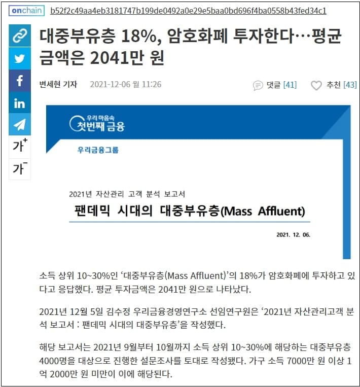 우리금융경영연구소가 6일 대중 부유층 4000명을 조사해 발표한 '2020년 대한민국 대중 부유층 보고서'에 따르면 이들의 총자산은 부동산 가격 상승과 금융자산 증가로 지난해보다 20% 가까이 늘었다. 투자자산 중 주식 비중을 크게 늘린 데 이어 앞으로도 총자산 가운데 부동산 비중은 줄이고 금융자산 비중을 늘린다는 의향을 내비췄다. 대면 서비스보다 모바일 앱을 더 선호하는 대중 부유층의 투자 향배에 금융권 디지털 혁신의 미래가 달렸다.