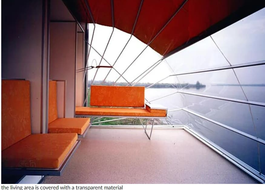 에두아르트 뵈흘링크는 악천후를 견디기 위해 지붕에 플라스틱을 입혔다. 게다가, 거실은 자연광이 침투할 수 있는 투명한 물질로 덮여 있는 반면, 수면 공간은 시장에 도달한 적이 없는 1986년으로 거슬러 올라가는 불투명한 body.an의 혁신적인 이동식 주택 개념으로 덮여 있다.