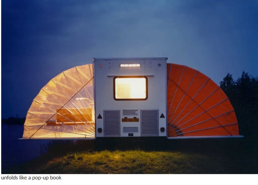 비록 창조적인 캠핑 디자이너들이 줄어드는 것이 요즘 추세이긴 하지만, 이 'de markies'(차양막)는 그 당시로서는 혁신적인 아이디어였다. 1985년으로 거슬러 올라가면, 이 소형 캐러밴의 초기 아이디어는 네덜란드 건축가 에두아르트 뵈틀링크에 의해 건축 대회를 위해 제안되었다. 이동식 주택으로 상상된 이 아코디언과 같은 캐러밴은 버튼을 누르면 양쪽으로 펼쳐지며 단 몇 초 만에 3배의 치수를 가질 수 있다.