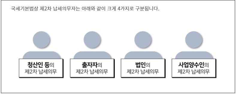 본래의 주된 납세자가 납세의무를 이행하지 아니하여 그의 재산에 대하여 체납처분(재산압류, 매각 등 일련의 강제징수 절차)을 집행하여도 징수할 금액이 부족한 경우에 주된 납세자와 일정한 관계에 있는 자가 그 부족액에 대하여 보충적으로 납세의무를 부담 하는 것을 말한다 help.jobis.co