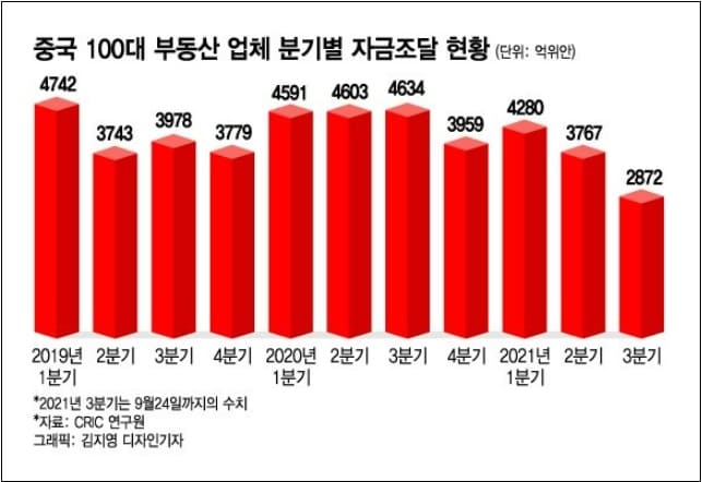 중국 100대 부동산 업체의 분기별 자금조달 현황을 보면 올해 3분기 자금조달 규모는 모두 2872억 위안(약 51조7000억원)으로 1분기 대비 약 33% 감소했다. 만기상환이 도래한 채권 규모는 커지는데, 신규 자금 조달이 어려워지면서 중소 부동산업체들의 디폴트(채무불이행)이 빈번하게 발생하고 있다.