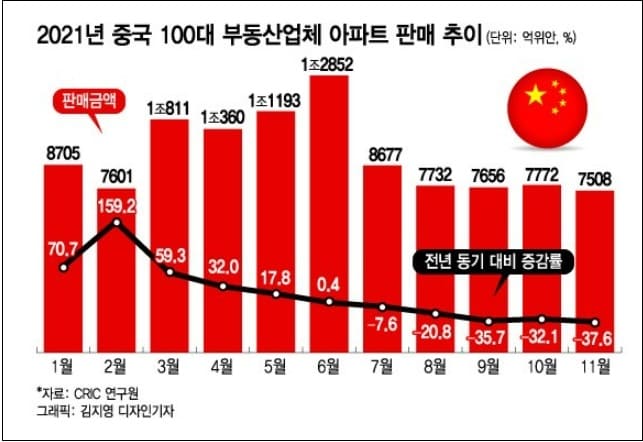올해 7월이후 중국 부동산업체의 아파트 판매금액이 급감하고 있다. 중국 부동산정보업체 커얼루이연구원(CRIC)에 따르면 지난 11월 중국 100대 부동산업체의 아파트 판매금액 합계는 7508억 위안(약 135조원)으로 전년 동기 대비 37.6% 쪼그라들었다. 중국 2위 부동산업체였던 헝다의 아파트 판매금액 순위는 5위로 하락했다.