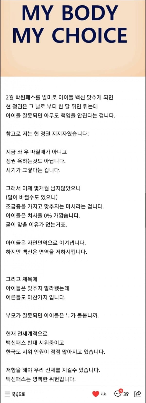아이들의 백신패스를 반대하는 분위기가 강력한 가운데, 아이들의 백신패스와 마찬가지로 어른들의 백신패스도 반대해야 하는 이유를 매우 간단하게 피력한 글이 있다.