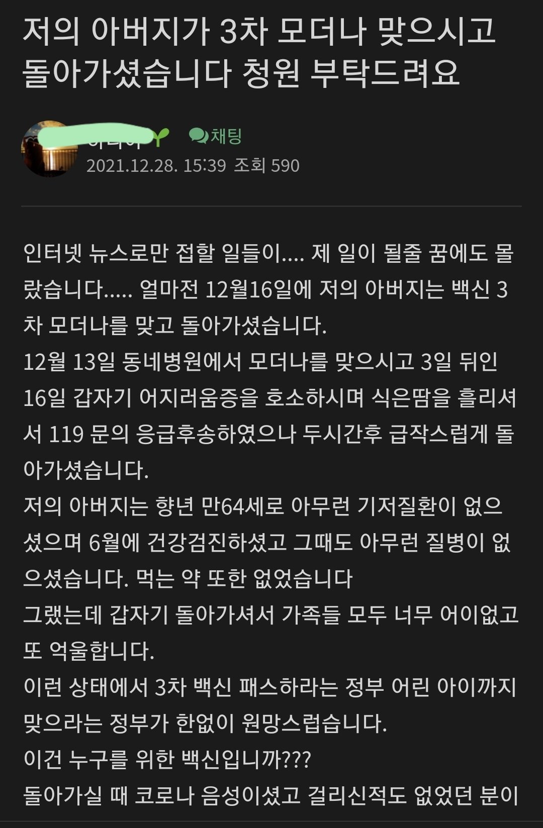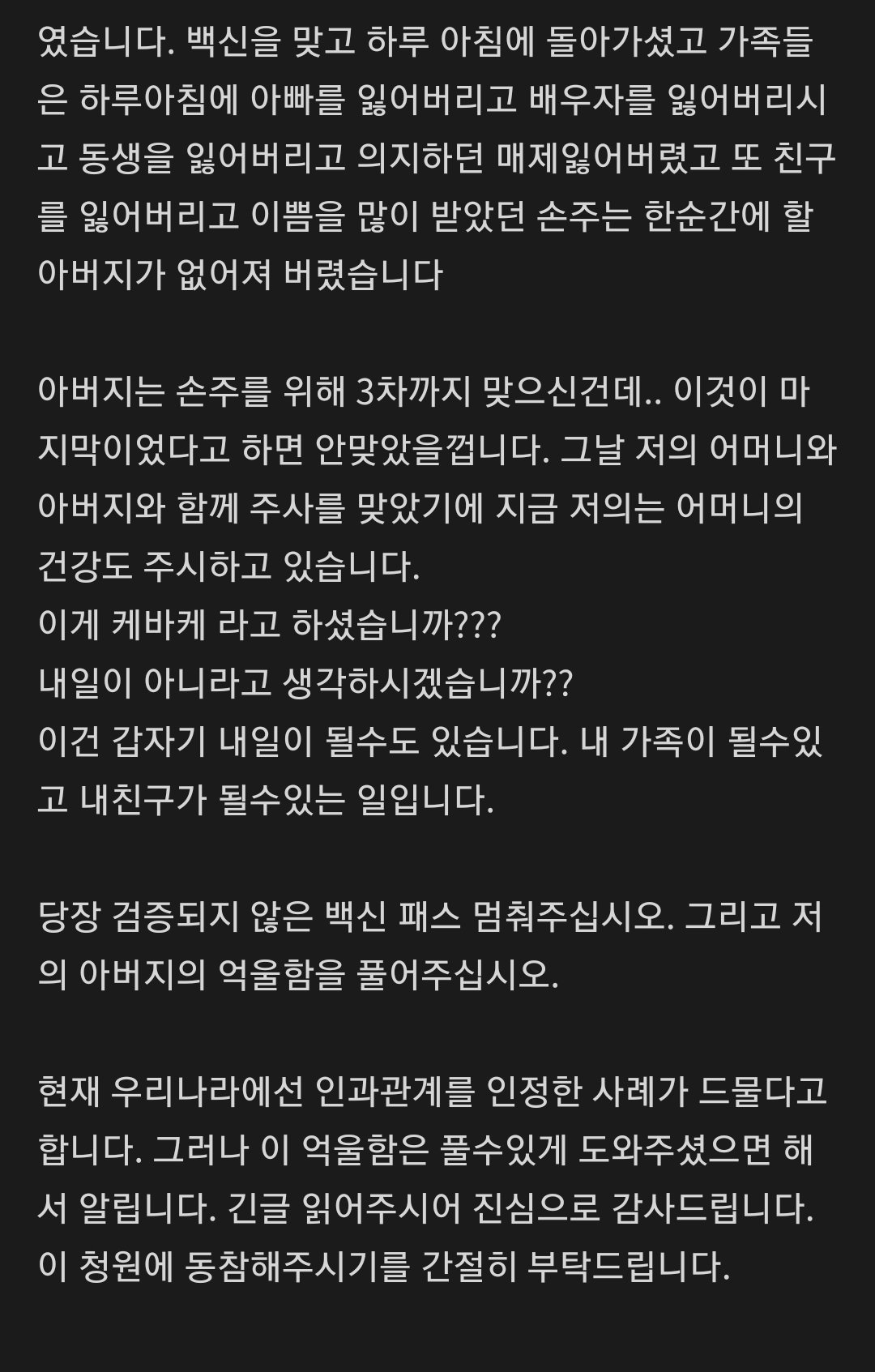 백신패스 당장 멈춰주십시오. 그리고 저의 아버지의 죽음을 밝혀주십시오. > 대한민국 청와대