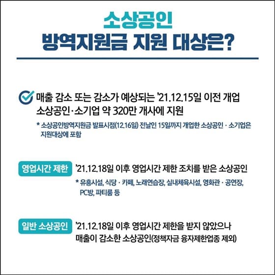 * 소상공인방역지원금 발표시점(12.16일) 전날인 15일까지 개업한 소상공인·소기업은 지원대상에 포함